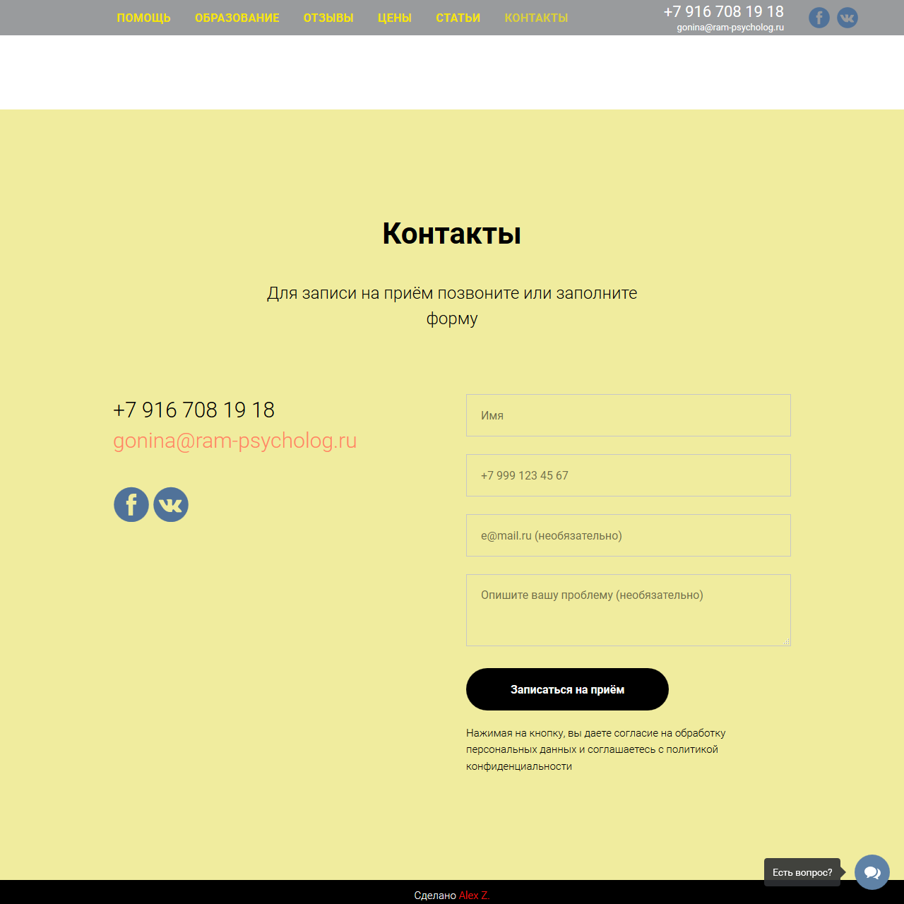 Landing частного психолога Разделы: описание услуг, отзывы, цены, обратная связь