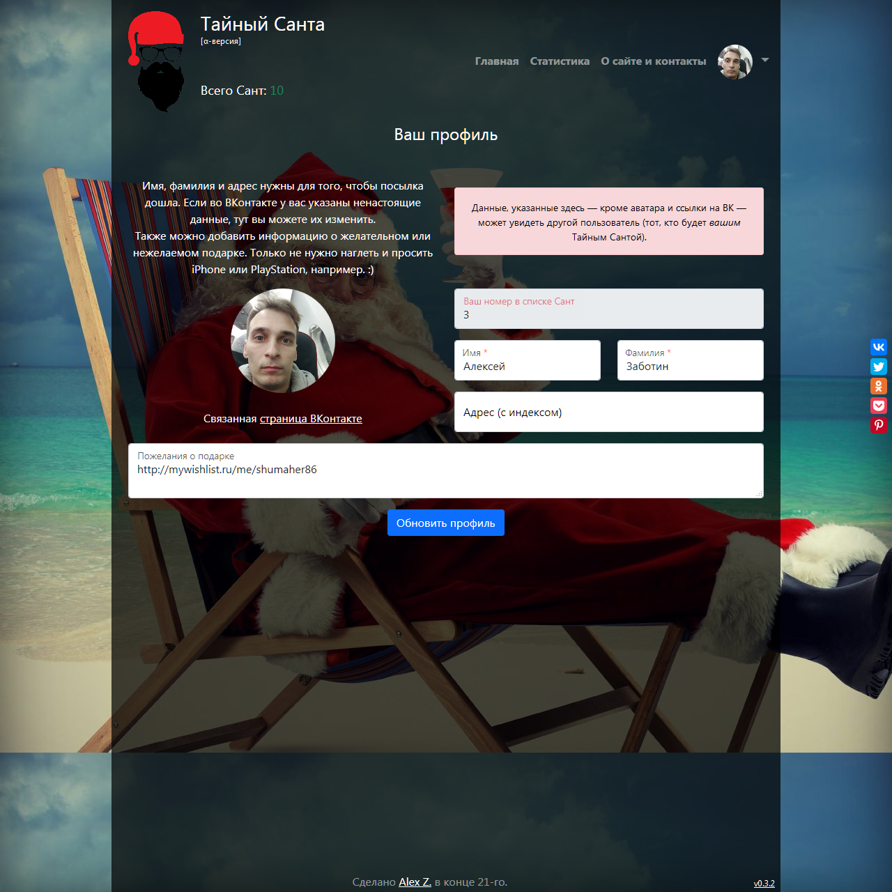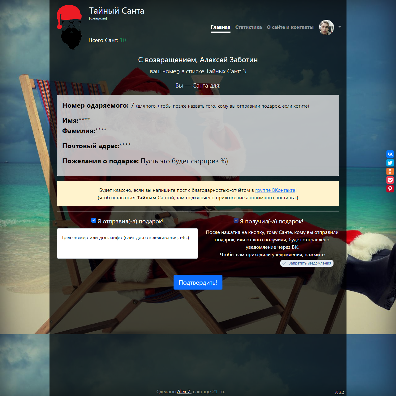 Сервис для анонимной отправки и получения подарков Разделы: описание, настройки, профиль, статистика